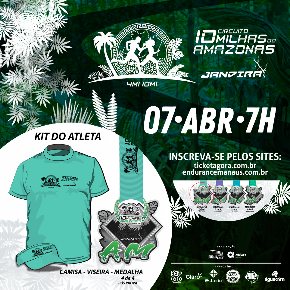 O evento denominado 10 Milhas do Amazonas – Etapa Jandira 2019 é uma realização da Endurance Sports e Ativos Eventos e será composta por duas provas pedestres em terreno de Chão Batido com lama, sendo uma com distância oficial de 4 Milhas, e outra com distância de 10 Milhas, que serão realizadas no dia 07 de Abril de 2019 (Domingo), na comunidade do Lago Ariauzinho-Jandira, tendo a participação de atletas regularmente inscritos de ambos os sexos, com largada e chegada acontecendo da seguinte forma: